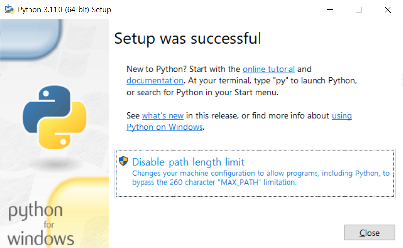 Disable path length limit은 경로가 260 character가 넘으면 최대 길이를 해제하는 옵션입니다. 클릭 후 Close합니다.