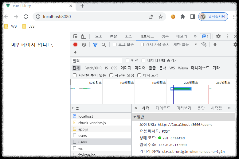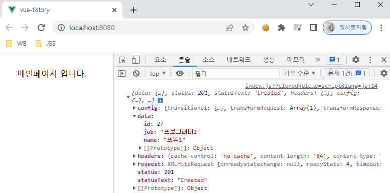요청 url이 정상적으로 상태 코드(201 Created)를 받은 것을 확인할 수 있습니다.